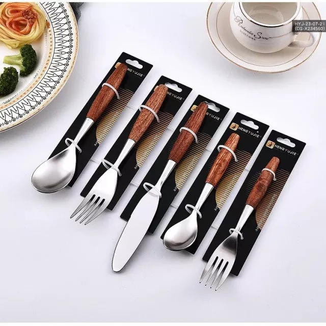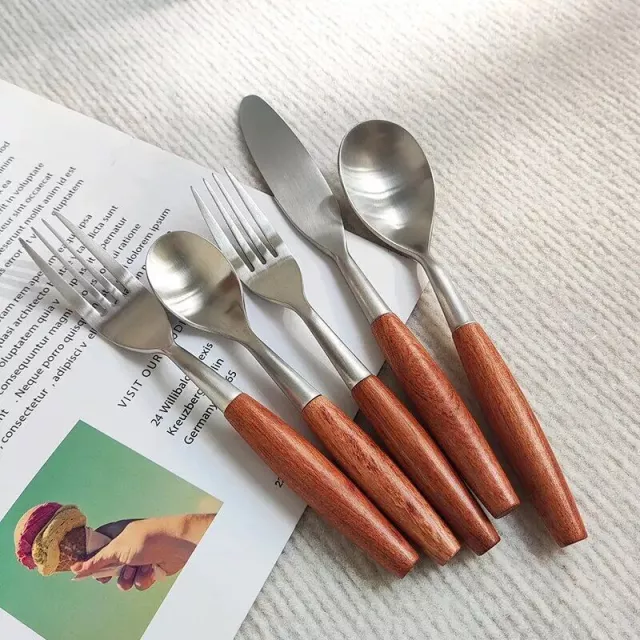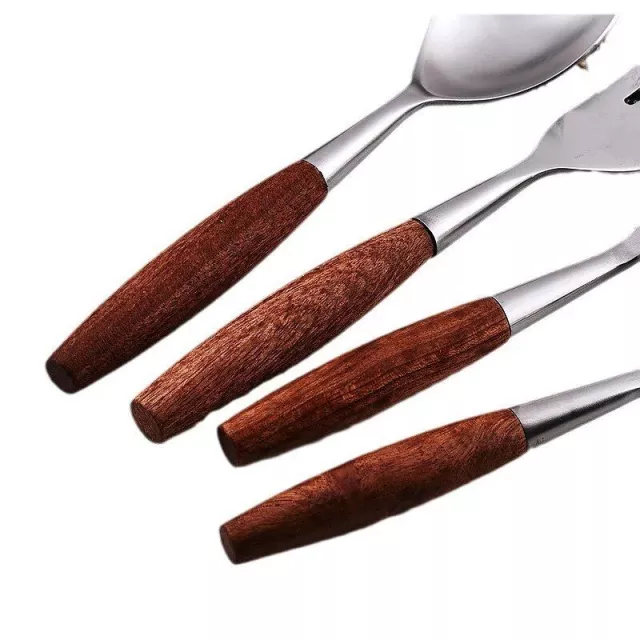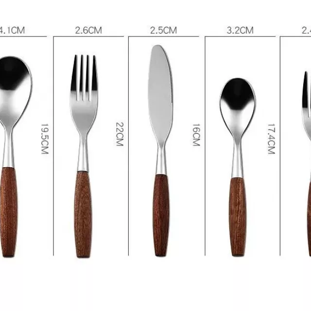 Crafted with a keen eye for detail, our cutlery set features high-quality stainless steel and solid natural wood. The stainless steel ensures durability and ease of cleaning, while the natural wood handles offer a comfortable grip and a rustic aesthetic. The unique matte finish on the wood further enhances its elegant appeal, making every meal a special occasion.